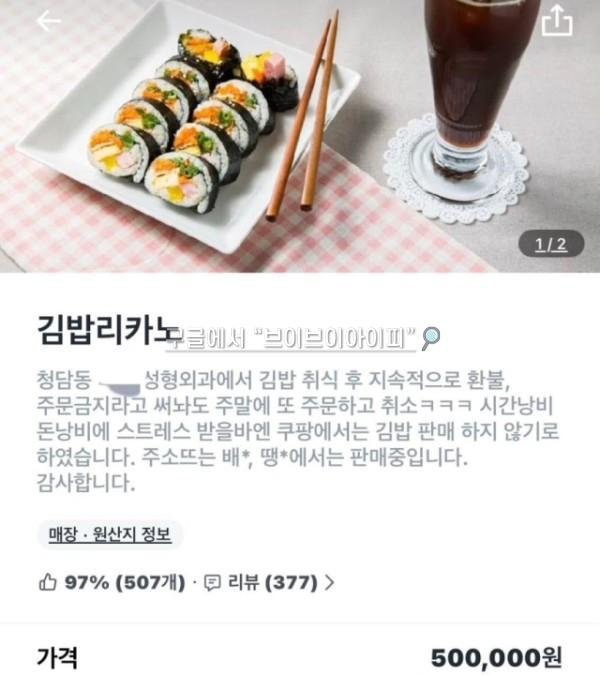설명란에는 "청담동 모 성형외과 주문 금지"라는 문구와 함께 "김밥 취식 후 지속해서 환불·취소를 반복해 주소가 표시되지 않는 플랫폼에서는 김밥을 아예 판매하지 않기로 했다"는 글이 담겼다. 주문 취소가 반복되자 아예 특정 고객을 차단하기 위한 조치였던 것이다.