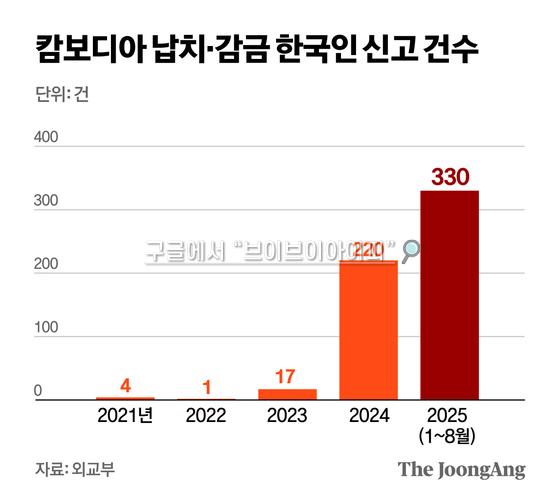 캄보디아에서 한국인 납치 범죄는 폭발적으로 급증하는 추세다. 외교부 자료에 따르면 현지 한국인 납치 신고 건수는 2022년 1건, 2023년 17건에서 지난해 220건으로 크게 늘었다. 또 올해 8월까지만 330건으로 지난해 수치를 이미 넘어섰다.