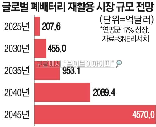 16일 에너지 시장조사업체 SNE리서치에 따르면 2030년 전 세계 전기차 폐차 대수는 411만대, 수명이 다한 배터리 양은 338GWh에 달할 것으로 전망된다. 같은 기간 폐배터리 재활용 시장 규모는 455억달러(약 67조900억원)로 지난해부터 연평균 17% 정도로 급성장해 2040년엔 2089억달러(약 307조7700억원)에 달할 것으로 예측된다.