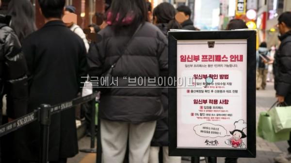 지난 15일 오후 5시쯤 대전시 중구 성심당 본점. 대전의 대표적인 빵집인 이곳에는 평일인 데도 빵과 케이크를 사려는 사람이 200m이상 줄을 서 있었다. 그런데 성심당 출입구 쪽에 눈길을 끄는 안내판이 보였다. ‘임신부 프리패스’를 알리기 위한 것이었다. 이 안내판 뒤로 수십명이 줄을 서 대기중이었다. 전국에서 찾은 임신부와 보호자 등이었다. 경기도 김포에서 왔다는 30대 부부는 “일반인은 몇시간씩 줄을 서서 기다리지만, 임신부는 매장에 신속하게 입장할 수 있다는 말을 듣고 달려왔다”라며 “프리패스는 임신부가 누릴 수 있는 일종의 특권 같다"라고 말했다.