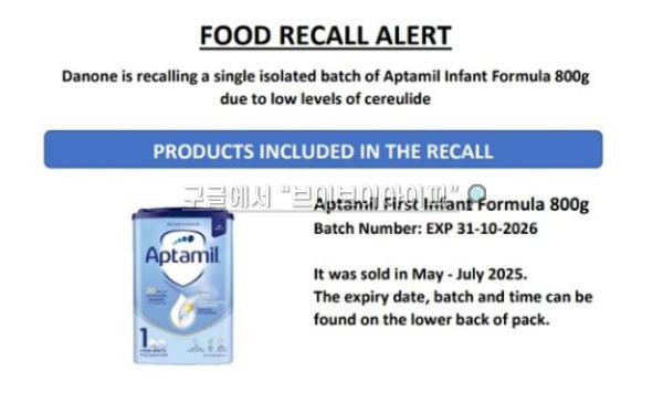 27일(현지시간) BBC에 따르면 프랑스 식품 대기업 다논은 지난 23일부터 800g 용량의 '압타밀 영아용 조제분유' 일부 제품에 대한 리콜 조치를 시작했다. 문제로 지목된 제품은 지난해 5월부터 7월 사이 영국을 포함한 유럽 국가에서 판매됐으며, 사용기한이 '올해 10월 31일'로 표기된 물량이다.