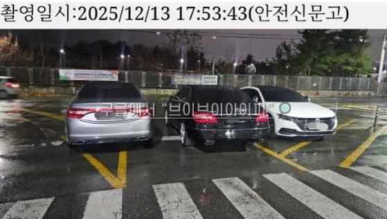 A 씨가 공개한 사진을 보면 문제의 차량들은 교차로 좌회전 차로 초입에 3대가 일렬로 세워져 있다. 해당 구간은 좌회전 차량이 유도선을 따라 진입해야 하는 공간으로, 차로 가장자리에는 차량 진입을 막기 위한 볼라드까지 설치돼 있었다.