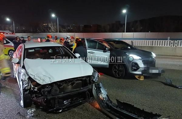 이 사고 충격으로 스포티지 차가 앞으로 밀려나면서 1∼2차로를 달리던 다른 차 2대와 잇따라 충돌했다. 모두 4대가 연쇄 사고를 냈다.