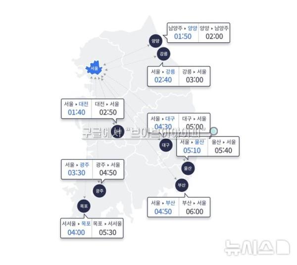 상행선은 ▲부산~서울 6시간 ▲대구~서울 5시간 ▲광주~서울 4시간50분 ▲대전~서울 2시간50분 ▲강릉~서울 3시간 ▲울산~서울 5시간40분 ▲목포~서서울 5시간30분이다.