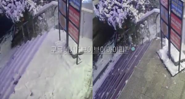 A씨가 배달 기사의 선행을 알게 된 건 지난 6일이었다. 가게 앞에 설치된 CCTV 영상을 확인하다가 배달 기사가 눈을 치우는 장면을 보게 됐다. 배달 기사는 빗자루를 들고 오더니 가장 아래 계단에서 한 칸씩 천천히 올라오며 소복이 쌓인 눈을 치우기 시작했다. 매장 바로 앞 평지에 쌓인 눈은 물론 입간판 뒤에 쌓인 눈까지 말끔히 치운 뒤 출입문 바로 앞에는 미끄럼 방지 패드까지 깔아뒀다.