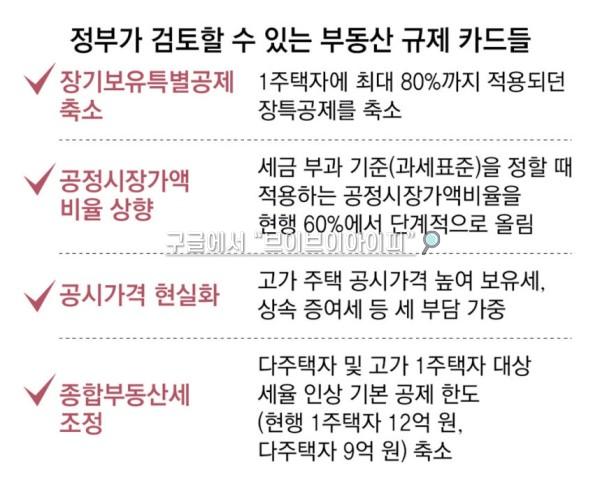 이 대통령은 이날 양도세 중과로 오히려 매물이 줄어들 것이라는 전망엔 “팔면서 내는 세금보다 들고 버티는 세금이 더 비싸도 그렇게(보유) 할 수 있을까”라고 밝히는 등 보유세 인상도 검토할 수 있다는 뜻을 내비쳤다. 윤석열 정부에서 완화한 공정시장가액비율 상향과 종합부동산세 기본 공제 한도 축소 가능성이 거론된다. 현행 60%인 공정시장가액비율을 80% 이상으로 상향 조정하면 공시가격 20억 원 주택 보유자의 종부세가 약 330만 원에서 480만 원 수준으로 즉시 상승하는 등 보유세 부담이 현실화된다.