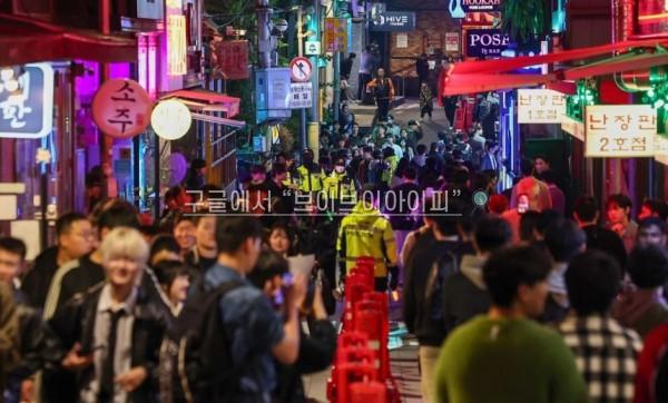홍대 관광특구 내에는 핼러윈 당일 11만명의 인파가 몰리며 밀집도가 우려 수위로 치달았다. 오후 9시께부터 홍대 레드로드에 설치된 대형 전광판에는 '매우 혼잡'이라는 붉은 글자가 표시됐다.