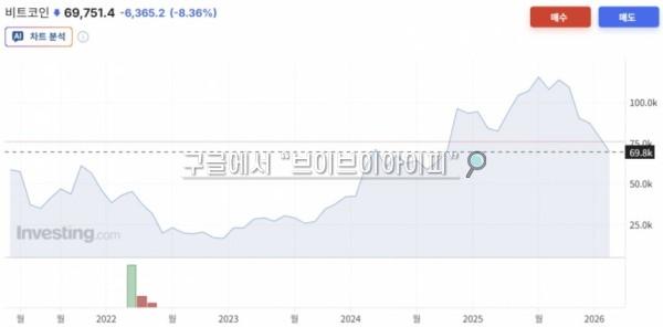 이날 비트코인은 장중 7만달러가 붕괴되며 2024년 11월 도널드 트럼프 미국 대통령 당선 후 최저 수준으로 떨어졌다. 지난해 10월 기록한 사상 최고치에 비해선 44% 넘게 추락했다. 한국시간 오후 9시 현재는 6만9751.4달러를 가리키고 있다.