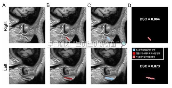 그 결과, 전문가가 수동으로 표시한 영역과 AI가 자동으로 분할한 영역의 일치 정도를 측정하는 DSC(Dice 유사도 계수, 1에 가까울수록 유사) 값이 두 차례의 검증에서 0.734, 0.714로 나타났다. 이는 AI가 찾아낸 영역이 전문가의 판단과 70% 이상 부합한다는 뜻으로, 의료영상 분야에서 높은 수준으로 인정받는다.