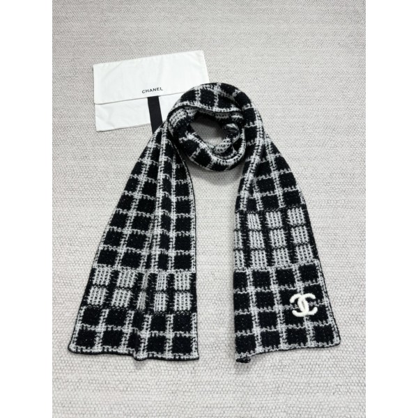 샤넬 25FW 25B 캐시미어 머플러 체크 CC로고 스톨 블랙 화이트 울 실크 AAB257 #타지아