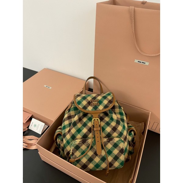 미우 미우 플래드 레더 백팩 카멜 그린 Miu Miu Plaid and Leather Backpack Camel Green 5BZ042-2IFK-F0HDZ 스몰 22*18*11.5cm / 라지 29.5*25*12.5cm > 가방