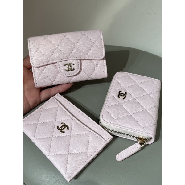 • 샤넬 CHANEL 라이트 핑크 캐비어 가죽 지퍼돌이 카드지갑 똑딱이 카드홀더 #지존샵